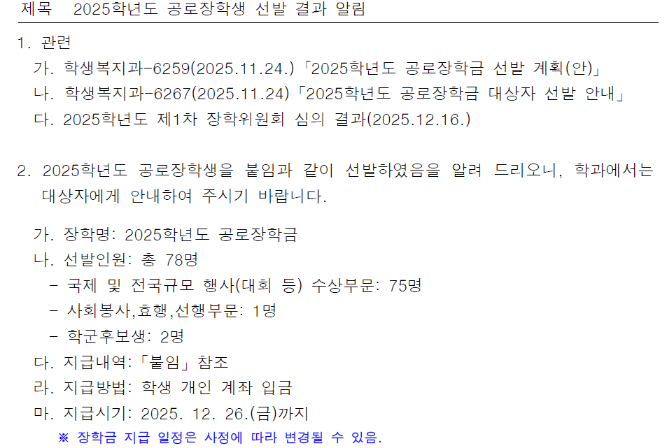 장학금은 학생 개인 계좌로 지급되며, 지급은 2025년 12월 26일까지 완료될 예정이다.